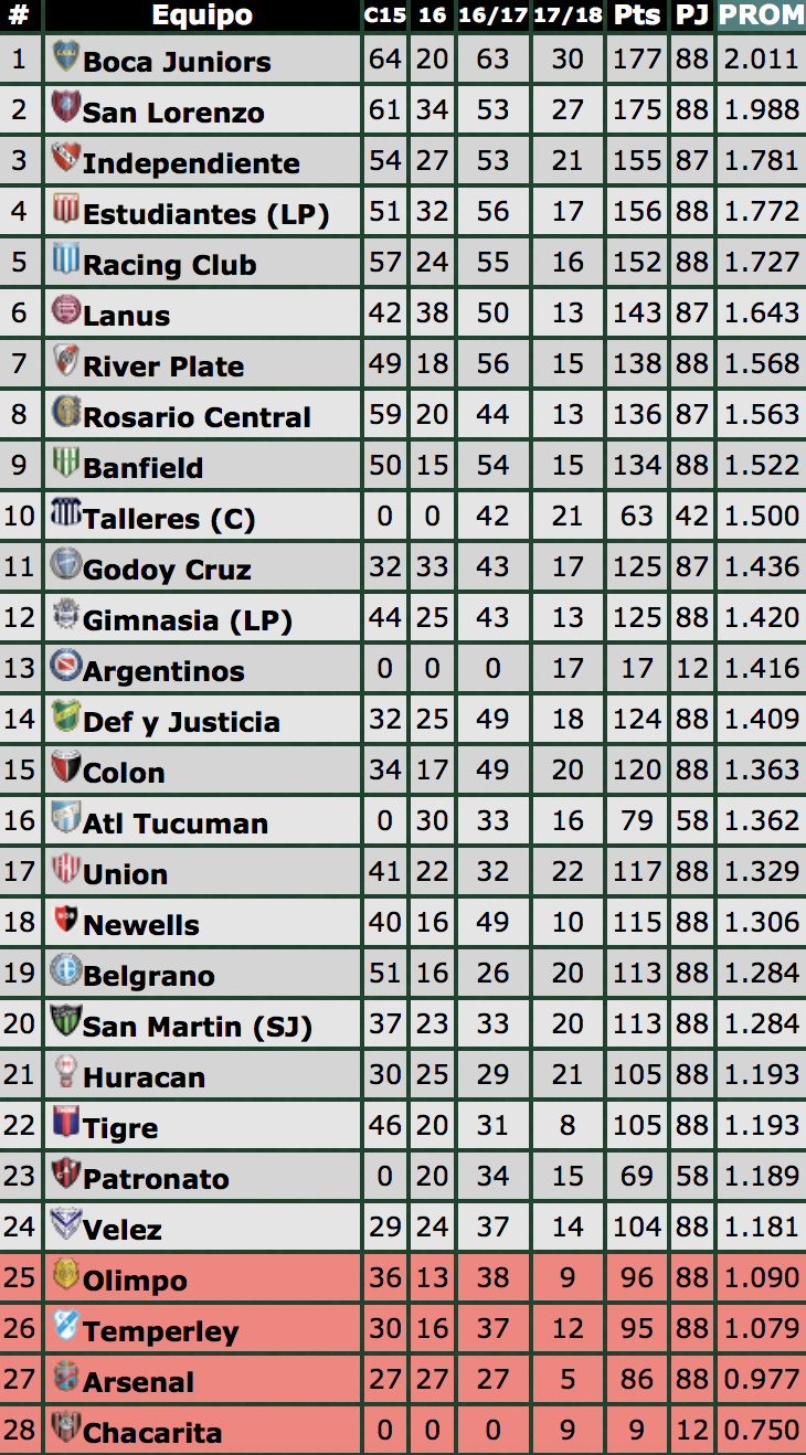 However, with fifteen rounds of action remaining there is plenty of time for twists and turns in the title race. Just as there is in the race for cup qualification and at the foot of the descenso table. The Superliga’s 28 clubs will become 26 for next season and so the action kicks off this week with a number of sides desperate to avoid the bottom four.