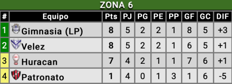 Group 6 will go down to the final game next weekend with Huracán looking to leapfrog both teams with a win over Patronato on Sunday. A flat Vélez deserved little from the visit of Gimnasia will need a result in Paraná next Saturday while Gimnasia know that a win over Huracán would be enough for them.